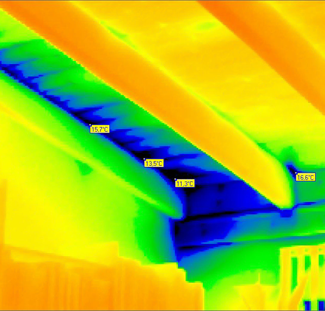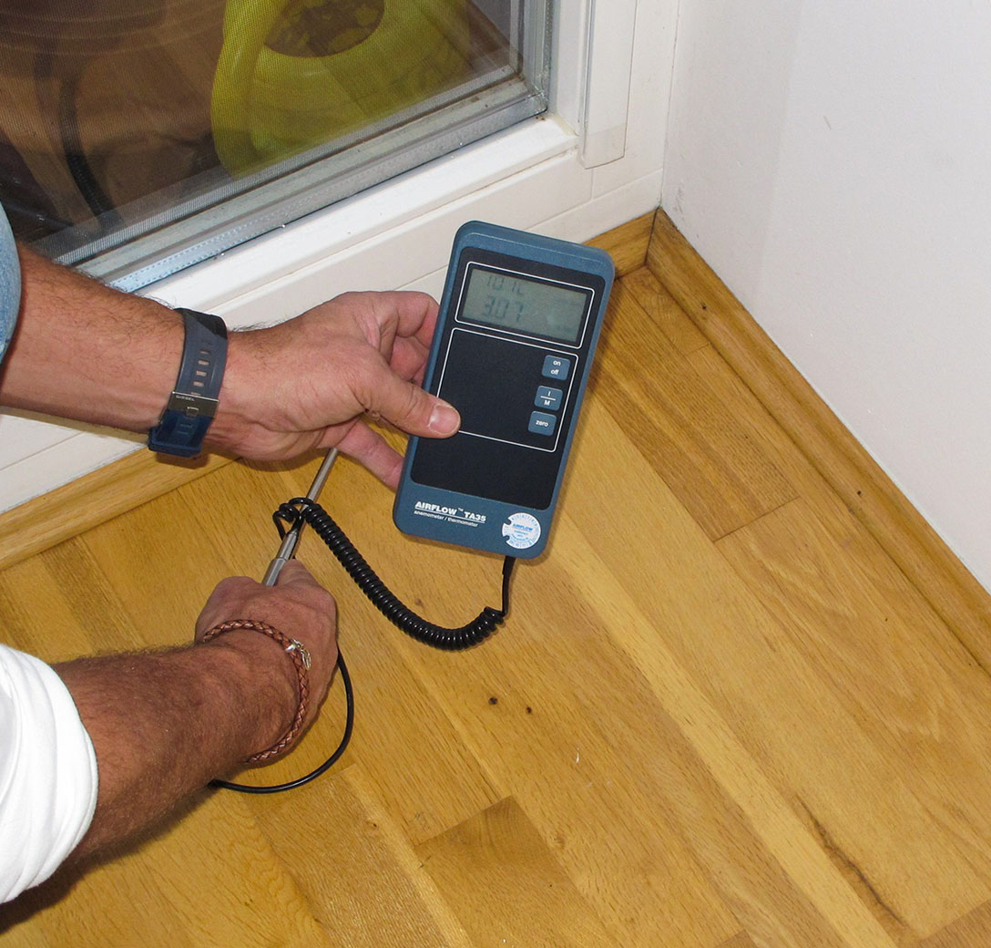 Es gilt: Die Einhaltung des Grenzwerts für die Luftdichtheit eines Gebäudes heißt noch nicht, dass das Gebäude auch mangelfrei ist! Die thermographische Leckagesuche bei Unterdruck im Objekt deckt Bereiche auf, in denen kalte Außenluft in den Innenbereich angesaugt wird. Die lokalisierten Luftundichtigkeiten werden dann mittels Strömungsanemometer überprüft und fotografisch dokumentiert. In besonderen Fällen kann zur Lecksuche auch Theaternebel (bei Überdruck) eingesetzt werden.